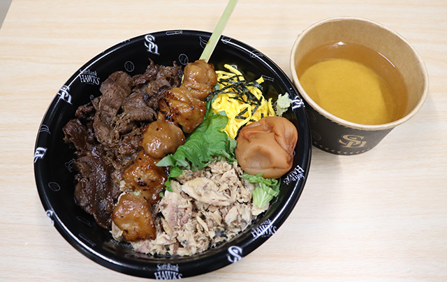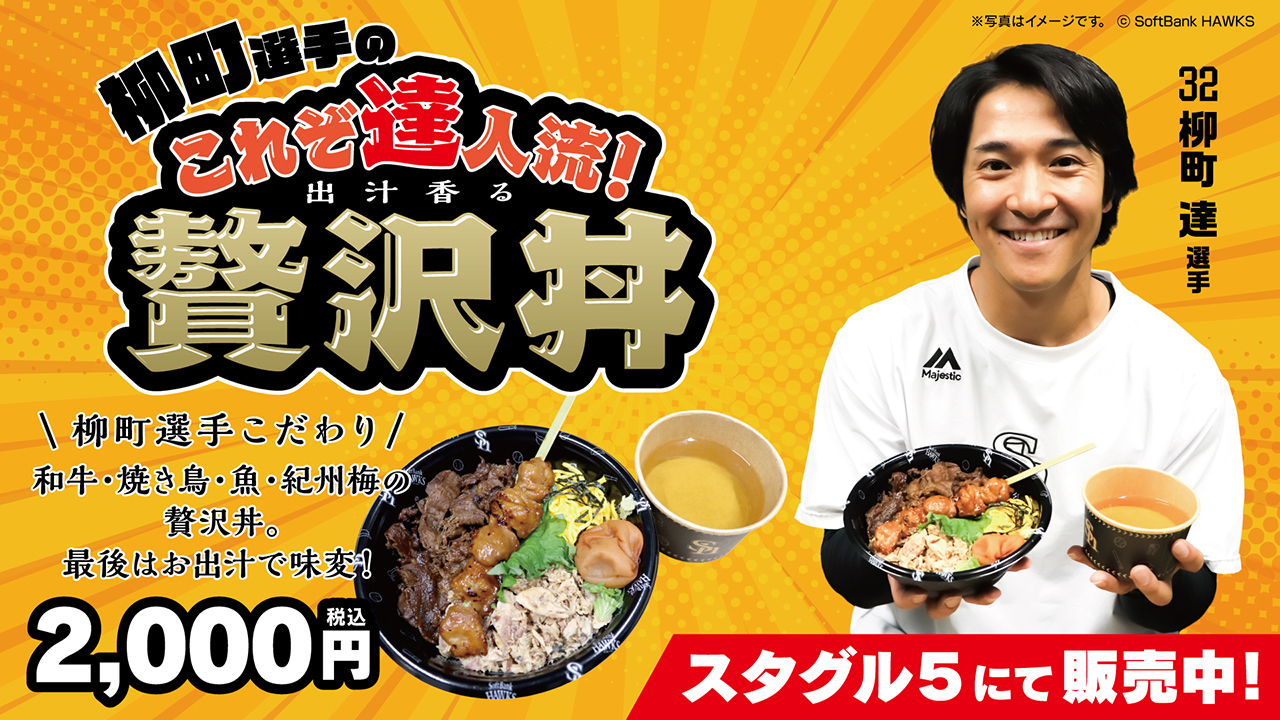 柳町達選手プロデュースの新グルメ「これぞ達人流!出汁香る贅沢丼」を、3月27日(金)の開幕戦より発売します!「丼ものながら、ひつまぶしのように味の変化を楽しめる一杯」をコンセプトに誕生しました。また、柳町選手の大学時代のチームメイトで北海道日本ハムファイターズの郡司裕也選手がHTB北海道テレビ「FFFFF(エフファイブ)」内企画で開発したコラボグルメに対抗し、両選手による“グルメ対決”が実現!みずほPayPayドームとエスコンフィールドHOKKAIDOにて双方の商品を販売し、販売数で競う企画がスタートします。極上の一杯を楽しみながら、グラウンド内外で繰り広げられる両選手の熱い戦いにもご注目ください。