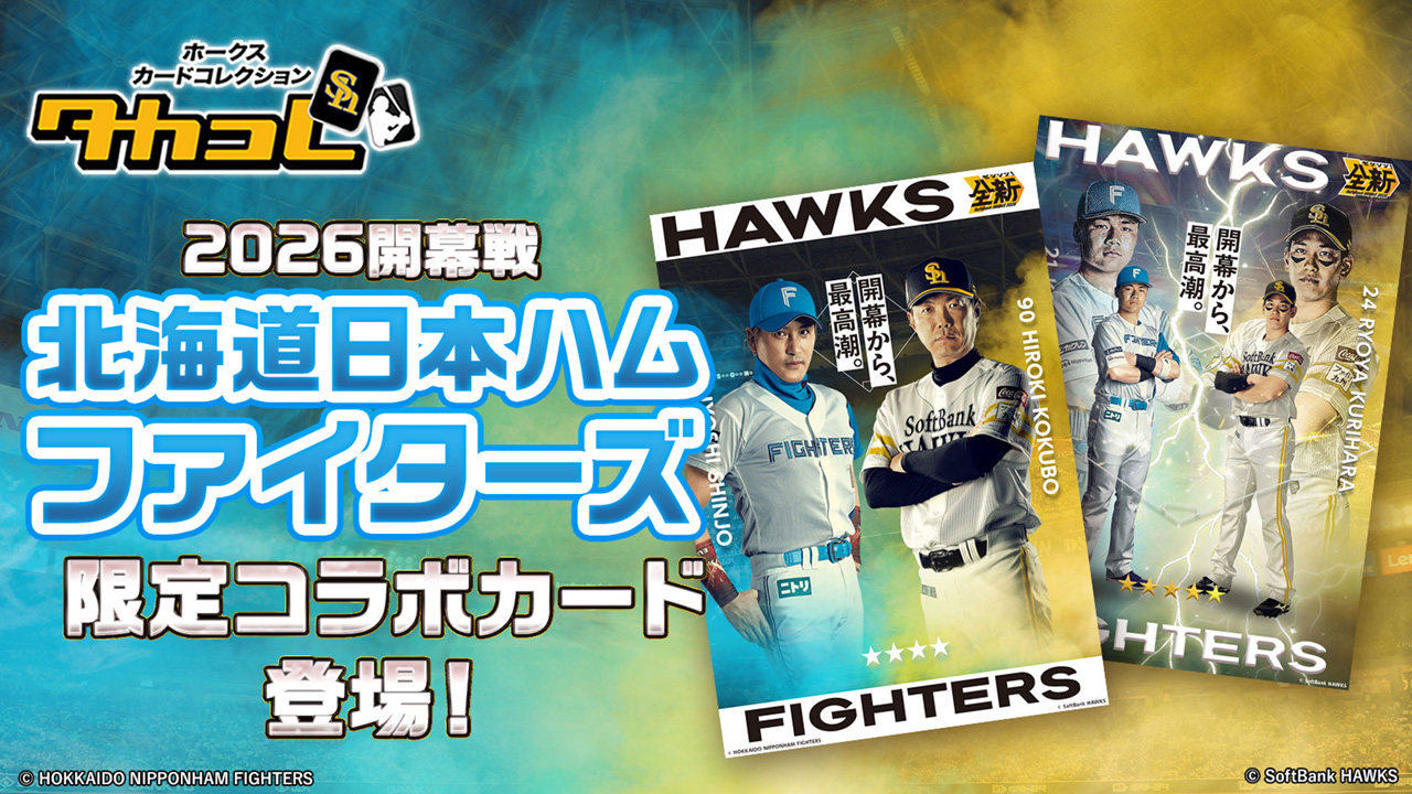 ホークスカードコレクション「タカコレ」では、北海道日本ハムファイターズとの2026開幕戦コラボカードが登場中!「タカコレ」でしか手に入らない特別な開幕戦デザインのコラボカードを今すぐゲットしよう!