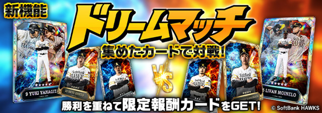 「ドリームマッチ」は、集めたカードを使って自分だけのチームを編成し、打順を組んで対戦を楽しめる新機能です。ステージ戦を進めることで報酬を獲得でき、条件達成後はプレイヤー対戦にも参加可能です。限定報酬カードも用意しており、これまで以上にカード収集と対戦の両方をお楽しみいただけます。