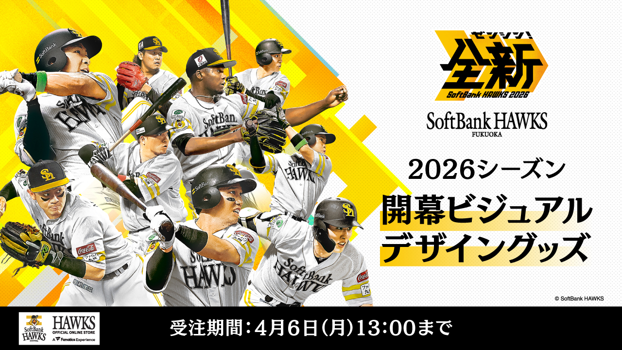 いよいよ開幕戦!2026シーズンの開幕戦キービジュアルグッズやホークス公式オンラインストア限定でほぼ等身大のアクリルスタンドを含む、スローガンロゴグッズ第2弾の受注販売がスタート!2026シーズンの幕開けを飾るアイテムとしてぜひチェックしてください!
