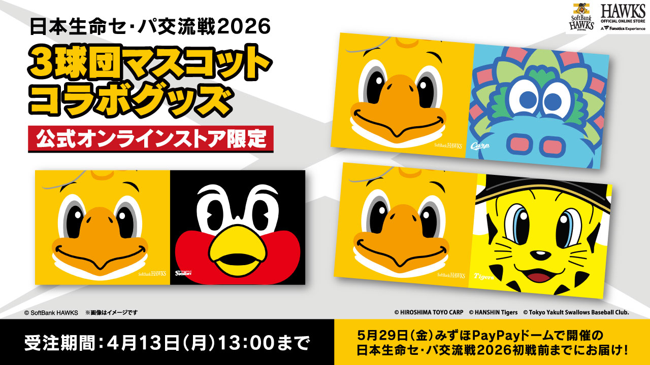 5月26日(火)より開催される日本生命セ・パ交流戦2026に先駆け、みずほPayPayドームで対戦予定のセ・リーグ3球団とのコラボグッズの事前受注販売が4月3日(金)より公式オンラインストアにてスタート!4月13日(月)までのご注文で5月29日(金)からのみずほPayPayドームでの試合前にお届けします。