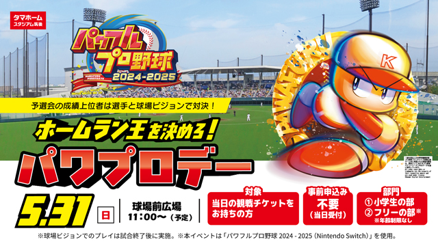 また、5月31日(日)は「パワプロデー」!人気ゲーム『パワフルプロ野球2024-2025』を使用したホームラン競争を実施します。成績上位者は球場ビジョンでプレイできる特別な体験のチャンスも…!