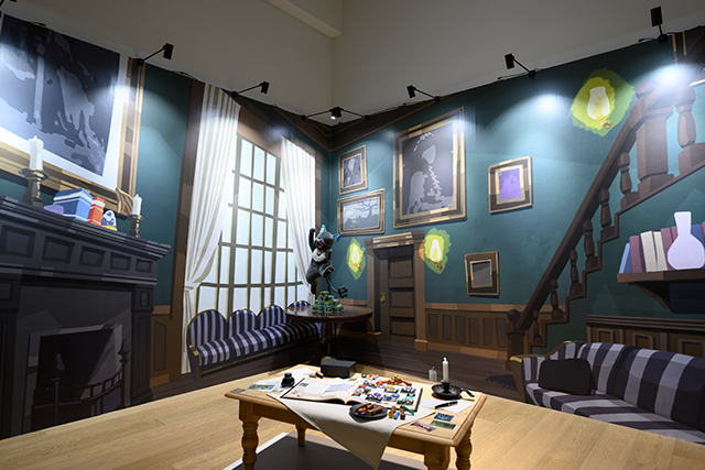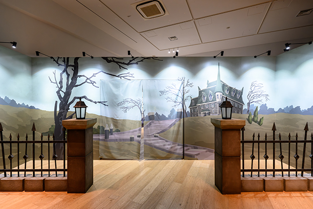 ゲストの皆様は、ここからご入場いただきます。装飾や映像で演出された「オンボロ寮」の空間をお楽しみください。メイン展示となる期間限定イベントのエリアへ、ゲストの皆様を誘います。