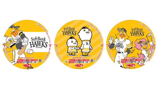 福岡ソフトバンクホークスのチームロゴやシンボルマークに加え、ハリーホーク、ハニーホーク、ふうさん、こふうさんを大きくデザインした特別仕様です。さらに、ご当地熱愛麺のロゴを野球ボール風にアレンジするなど、野球ファンに嬉しい遊び心あふれるデザインとなっています。