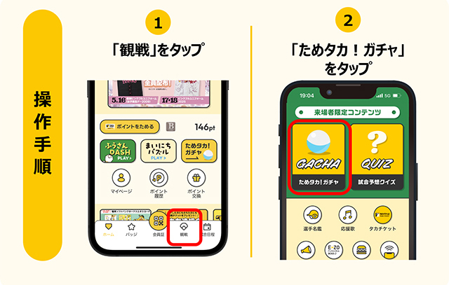 ためタカ!アプリ>「観戦」>「ためタカ!ガチャ」>「来場者限定」より、来場された試合日を選択してご参加ください。