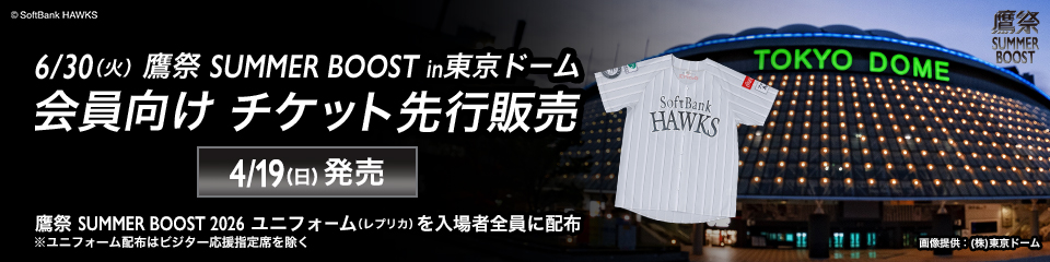 東京ドームで6月30日(火)に開催する鷹祭 SUMMER BOOST 2026のチケットを、ホークス公式チケット販売サイト「タカチケット」にて販売開始!