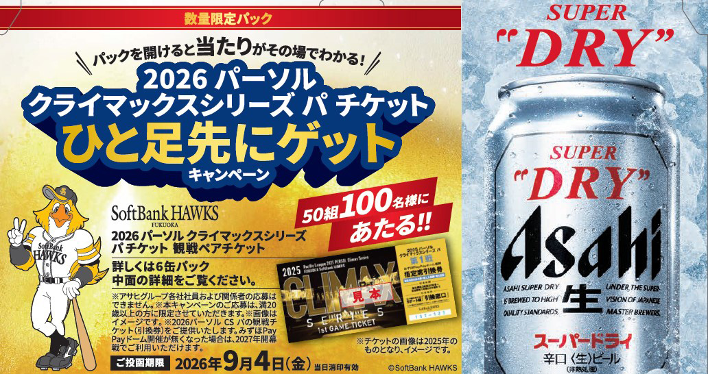 アサヒビール株式会社は、『アサヒスーパードライ がんばれ!福岡ソフトバンクホークス6缶パック』を、九州エリア限定企画として、6月30日(火)から完全予約受注制で販売します。販売開始に合わせて、みずほPayPayドームで開催される2026 パーソル クライマックスシリーズ パの観戦ペアチケットが50組100名に当たる「2026 パーソル クライマックスシリーズ パ チケットひと足先にゲットキャンペーン」を実施します。