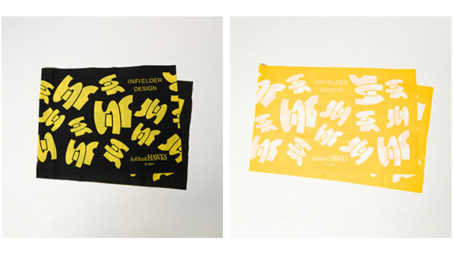 「INFIELDER DESIGN」の手ぬぐいをボディに、ホークスのロゴをモチーフにした総柄のグラフィックを施しました。応援シーンはもちろん、首元やバッグに巻くだけでスタイリングのアクセントにも。インテリアとして飾っても存在感のあるデザインです。