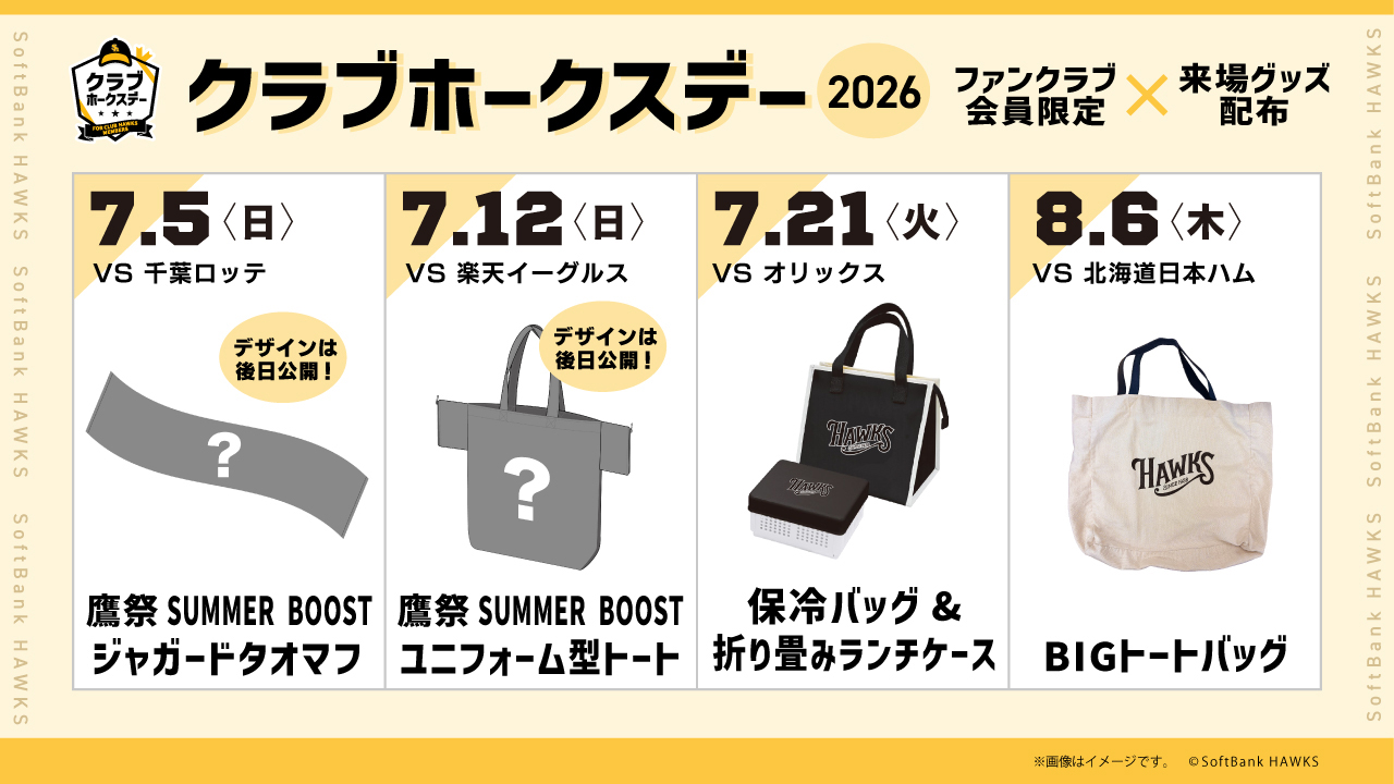 - 特典のお渡しは1会員につき1回のみ、クラブホークス会員ご本人のみが対象です。会員証(デジタル会員証含む)の第三者への譲渡や貸与が発覚した場合、会員規約に則り処分の対象になる場合があります。