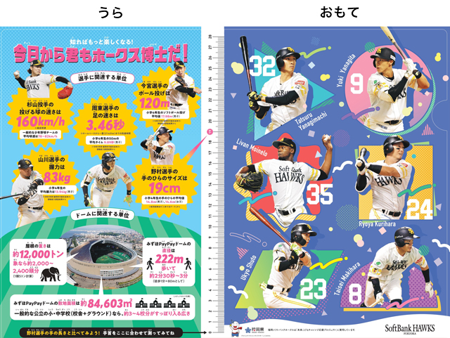 各学校への配布に先駆けて、本日4月18日(土)試合前に、みずほPayPayドームにて贈呈式を実施しました。上田哲子福岡県副知事にもご参加いただき、事前募集で選ばれた児童へ、小久保裕紀監督・栗原陵矢選手会長から、1年生へ下敷きを、4年生へクリアファイルをそれぞれ手渡しました。