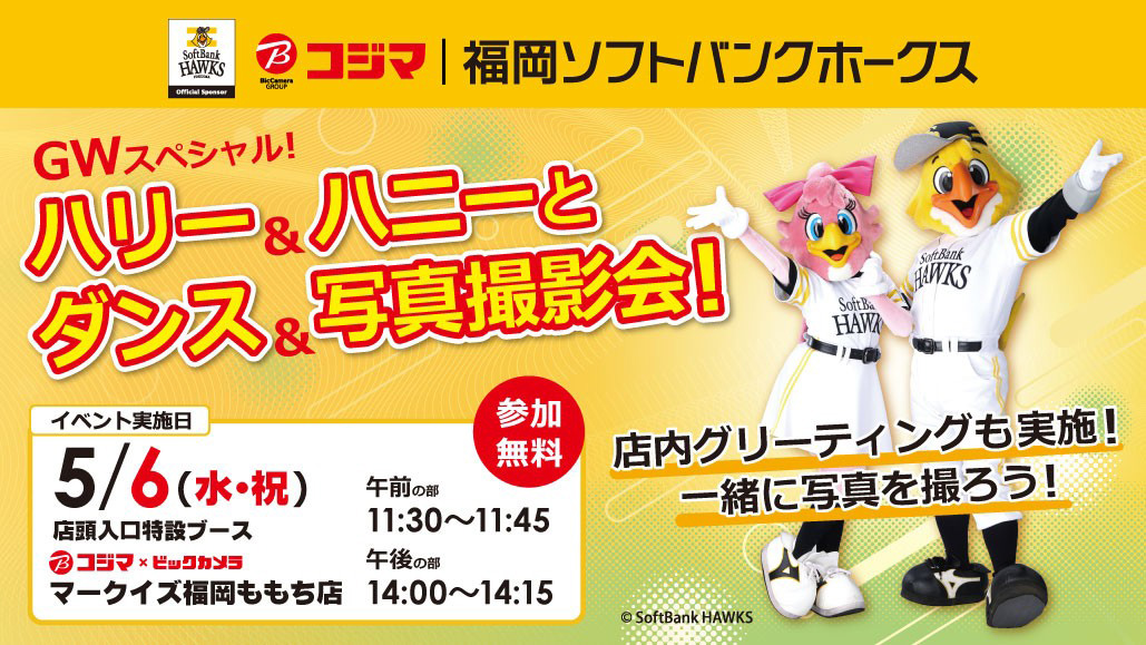 5月6日(水・祝)、「ハリーホーク」および「ハニーホーク」が、コジマ×ビックカメラ マークイズ福岡ももち店に来場します。