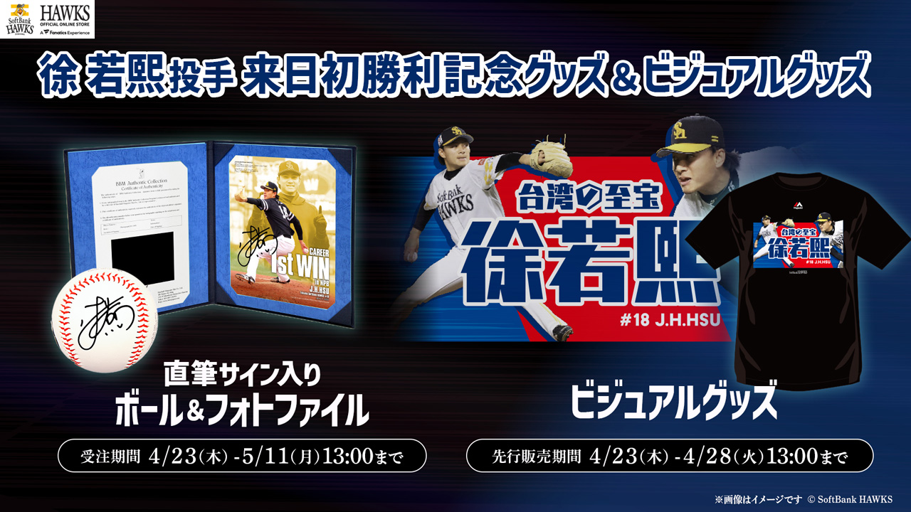 4月1日(水)の東北楽天ゴールデンイーグルス戦で、徐若熙投手が来日初勝利を記録しました!その初勝利を記念して、直筆サイン入りフォトとボールを数量限定で公式オンラインストア・HAWKS STOREにて4月23日(木)から受注販売を開始します。また、徐若熙投手の躍動感あふれる投球フォームの肖像を大きく配置したデザインのビジュアルグッズも登場!こちらは、公式オンラインストアにて4月23日(木)に先行予約販売スタート!ぜひこの機会にゲットしよう!