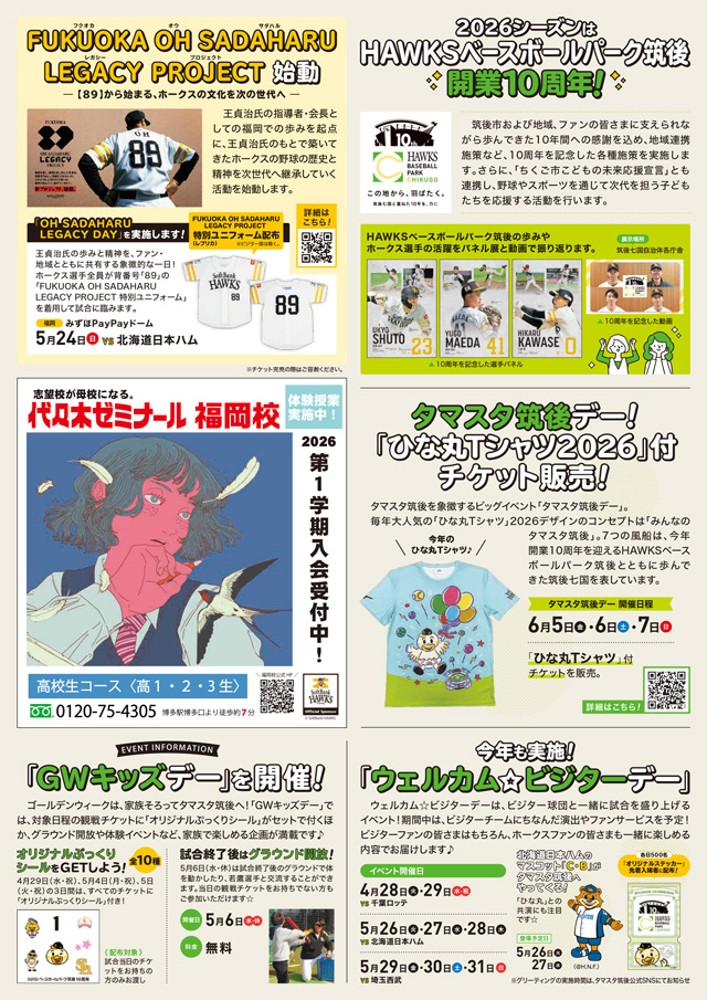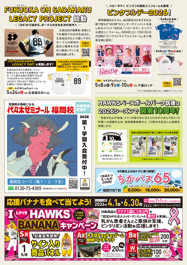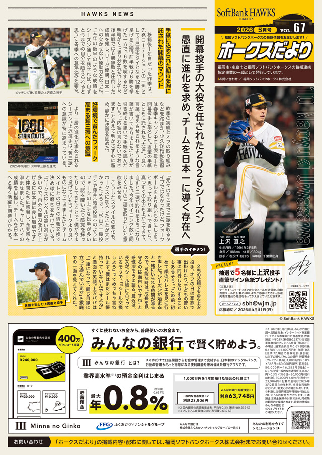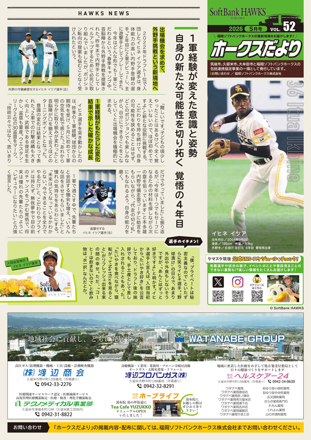 福岡市・糸島市、筑後市・久留米市・大牟田市と福岡ソフトバンクホークスの包括連携協定事業の一環として、『ホークスだより』を発行しています。5月号の福岡市・糸島市版は上沢直之投手、筑後市・久留米市・大牟田市版はイヒネ イツア選手を特集した内容でお届けします。