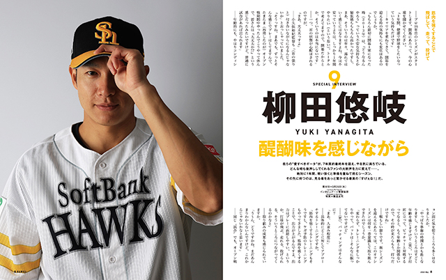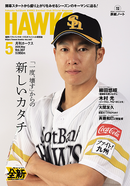 打撃のキーマンとして、柳田悠岐選手が表紙を飾ってくれました。インタビューでは、ここ2年のケガによる長期離脱から再びレギュラーをつかむべく、7年契約最終年への強い思いを言葉にしています。ホークスが誇る主砲が明かす原動力とは!?