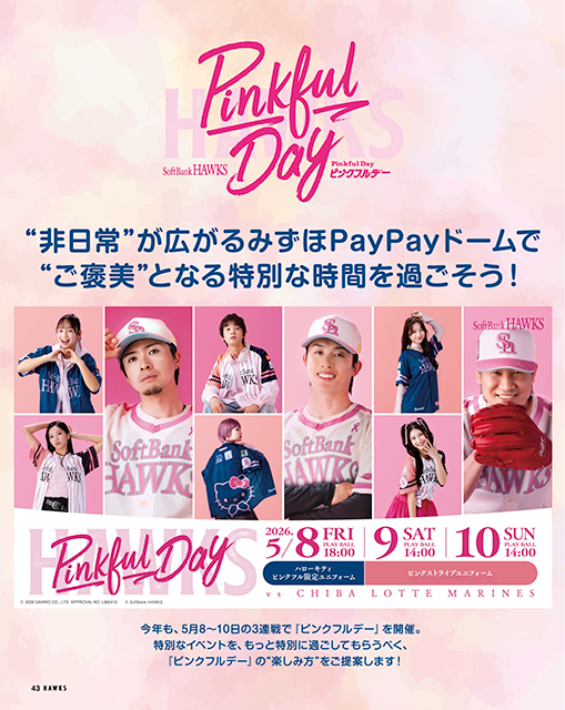 最大のライバルとなるであろう北海道日本ハムファイターズを相手に本拠地・みずほPayPayドームで3連勝を収めた開幕カードを振り返る企画に、5月8日(金)~10日(日)に開催される『ピンクフルデー』でのさまざまな楽しみ方を提案する企画もあります。