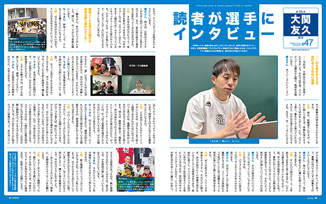 『月刊ホークス』年間定期購読プレミアムプランに加入する読者の方が選手に聞きたいことを質問する人気企画「読者が選手にインタビュー」も、この号からリスタート。今回は大関友久投手がファンからの多彩な質問に、真摯に丁寧に答えてくれました。