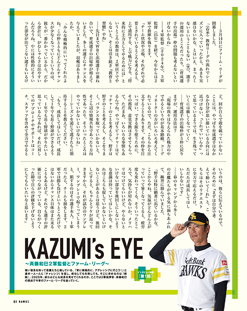 4月号に引き続き情報盛りだくさんでお届けするファームトピックスでは、斉藤和巳2軍監督のインタビュー連載がスタート!今年から再編されて「ファーム・リーグ」となった2軍公式戦を、指揮官の視点で追っていきます。まずは開幕にあたって、選手に期待するところなどを聞きました。