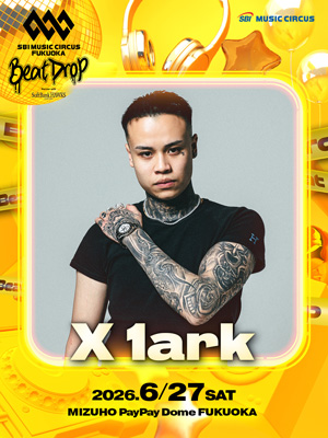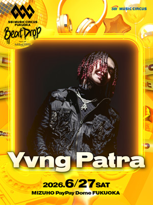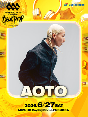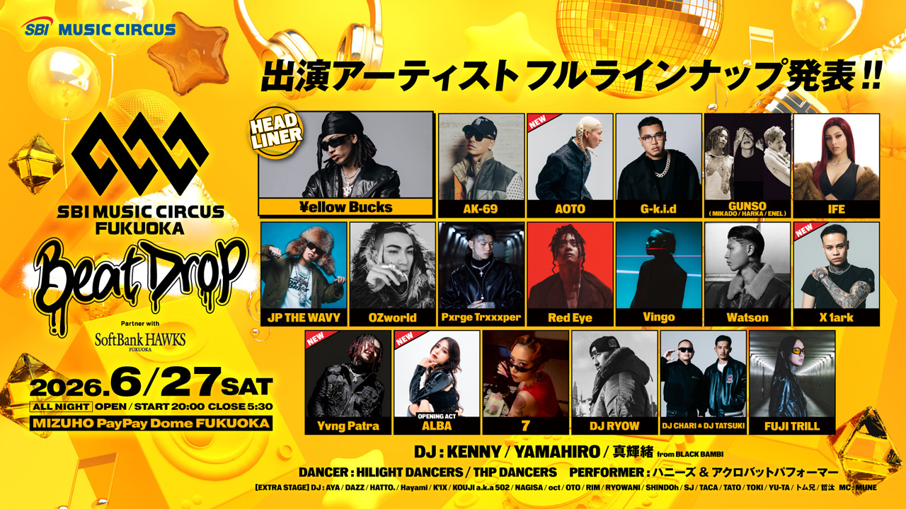 6月27日(土)みずほPayPayドーム福岡で開催する、HIPHOPを中心とした熱量あふれるパフォーマンスと迫力ある演出で音楽との一体感と高揚感を味わえるオールナイト音楽フェスティバル「SBI MUSIC CIRCUS FUKUOKA -Beat Drop- partner with SoftBank HAWKS」の出演アーティストのフルラインナップを発表いたします。