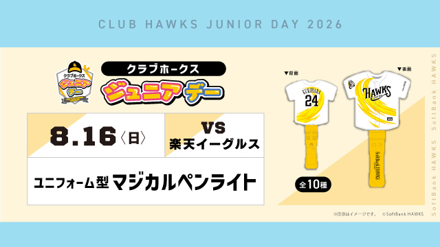 中学生以下のクラブホークス会員の方に限定した「クラブホークス ジュニアデー」の開催が決定しました!当日の観戦チケットをお持ちの対象会員の方へクラブホークスオリジナルユニフォーム2026デザインの限定グッズを配布します。また、当日は「クラブホークスオリジナルユニフォーム2026」着用で「アクリルキーホルダー」(全12種・シークレット)も配布します。
