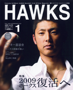 今月号では2009年第1号目として、来季ホークス復活へ欠かせない選手たちにズームアップ。再起を図るエース・斉藤和巳投手の1年2ヶ月ぶりの表紙登場をはじめ、気になる新人選手たちの入団会見の様子をご紹介します。