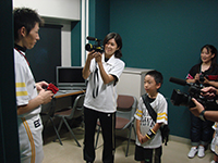 オフィシャルメディア取材見学では本多雄一選手と馬原孝浩投手へのインタビューに実際に立ち会い、サプライズとして実際に取材で使用しているカメラを持っての「模擬取材」も体験していただきました。