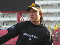 | たくさんのファンの声援を浴び、グラウンド入りした秋山監督 |