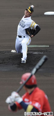 先発への思いがこもった29球だった。キャンプ最終日の今季初実戦。"プロ初先発"した攝津投手が、先発テスト第1弾を省エネ投法でクリアした。初めて登ったまっさらなマウンド。2回表に最後の打者を外角低めいっぱいの138km/h直球で見逃し三振で仕留めると、爽快に汗を拭った。
