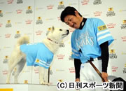 お父さん、日本一になるワン!内川聖一選手が25日、携帯電話のCMで有名なお父さん犬と初対面。ホークス応援隊長でもあるお父さんに日本一を誓った。