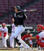 多村仁志選手が13日、対外試合で豪快2発だ。マツダスタジアムで行われた広島との実戦形式の合同練習で、2回に今季初アーチとなる左翼防球ネット直撃弾を前田健投手から放った。5回にも上野投手から左翼上段席に一打。東日本大震災で複雑な心境を抱えつつ、昨年チーム3冠王が仕上げの段階に入った。