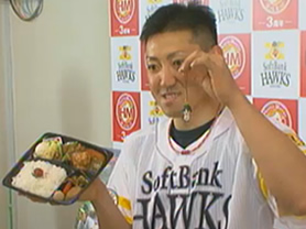 内川選手はまず用意されたホークス弁当をぱくりとひと口。「非常においしいです。見た目もボリュームがあって良いですね」と気に入り、次々とおかずを口に運んでいました。