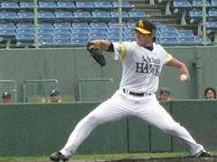 打線は先制された直後の3回裏に本多雄一選手のタイムリーと内川聖一選手の犠飛で逆転。そして5回、この日が復帰戦でいきなり4番に座った松中信彦選手がセンター前タイムリーを放ちました。松中選手は9月14日(水)のライオンズ戦(ヤフードーム)で右ひざに死球を受けて骨折。それ以来の実戦でした。「1カ月以上離れていたので、2打席目まではイメージ通りいかなかった。(タイムリーを打った)3打席目からようやくタイミングがとれたし、ボールもしっかり見えた。3打席立たせてくれた首脳陣に感謝したい」と笑顔交じりで話しました。回復具合は「6割程度」と言いますが「痛みはない」と断言します。「チームに迷惑にならないよう、しっかりと判断したい。でも、CSで良い思いをしていない。悔しさを晴らしたいという気持ちは人一倍ある」と出場へ意欲を燃やしました。