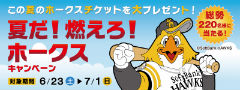 いよいよ夏本番!後半戦もホークスを盛り上げるべく、オッズパークでは「夏だ!燃えろ!ホークスキャンペーン」を実施中です!後半戦チケットゲットの大チャンス!ぜひこの機会にご応募下さい。