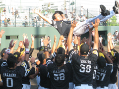 そして5対5の9回表、田上選手が今度は二塁打でチャンスメイクすると相手バッテリーミスで勝ち越し。さらに仲澤忠厚選手の二塁打で7点目を奪い、試合を決めました。