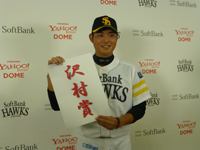 10月29日(月)、攝津正投手が投手最高の栄誉である「沢村賞」を受賞することが決まり、同日ヤフードーム内のプレスカンファレンスルームにて会見を行いました。ホークス球団では別所昭投手(1947年)、斉藤和巳投手(2003年、2006年)、杉内俊哉投手(2005年)以来、4人目(5度目)の沢村賞投手誕生となりました。