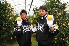2月4日(月)、春季キャンプ最初の休日を利用して、ルーキー5選手が休日1日体験を行い、宮崎特産品である日向夏の収穫体験と宮崎牛鉄板焼き体験を行いました。