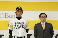 3月7日(木)、2013年度のユニフォームスポンサー(左袖ならびに右腰)契約に伴い、お披露目発表会見がヤフオクドーム内のプレスカンファレンスルームで行われました。また、右袖にはホークス創立75周年を記念したワッペンが貼付されることも決まりました。