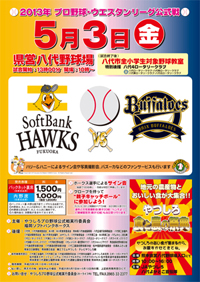 5月3日、県営八代野球場で、ウエスタン・リーグ公式戦 福岡ソフトバンクホークス対オリックス・バファローズ を開催いたします。やつしろ食と農の祭典も同時に開催されます。
