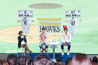 普段は見られない私服姿で登場した2人は、揃ってピンクを取り入れる意外な(?)コーディネート。帆足投手は「鷹の祭典を意識しました!」とパープルのパンツルックで、早くも気合い全開です。帆足投手は交流戦で4戦4勝と大活躍。吉村選手も5月12日(日)のライオンズ戦(熊本)での決勝3ランなどここ一番という場面で豪快なホームランを打ってきました。帆足投手はプロ入りまでの話を披露。「高校時代はプロになれるなんて全く考えていなかった。当時はスキーのインストラクターになろうと思っていました」と話すと、客席からは驚きの声も上がりました。吉村選手は独特の空気感で、徐々にファンの心をつかんでいき、ヨーロッパへ独り旅をした時のエピソードなどを話しました。