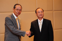 松中選手が、大阪府への寄付金贈呈式に出席して橋下知事と歓談