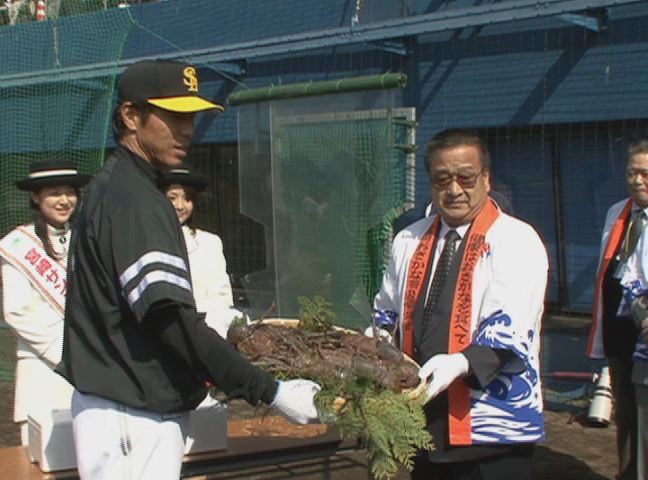 秋山監督、大きな伊勢エビやかつおを手に笑顔