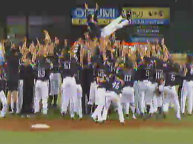 連覇ダ!歓喜の輪のなかで、秋山監督が宙を舞った