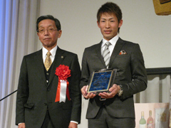 本多選手が故郷から表彰を受け、喜びいっぱいの笑顔!
