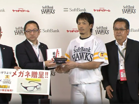 松田選手「かけ心地がいい」とご満悦!「メガネのヨネザワ」様よりホークスコラボのサングラスを贈呈いただきました