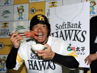 五十嵐投手はキレイ好き! ホークスコラボ「激落ちくん」の贈呈式に出席