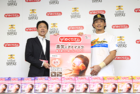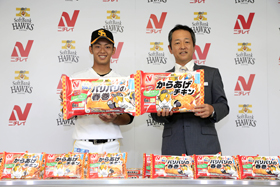 今宮選手、力強い援護に笑顔。コラボ商品の贈呈式