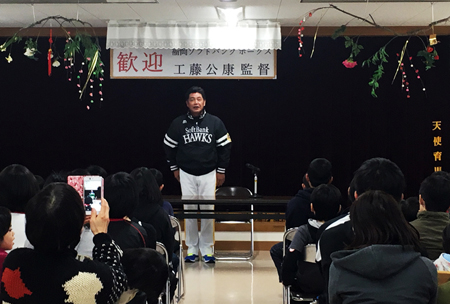 豪速球やカーブも披露!工藤監督が天使育児園を訪問