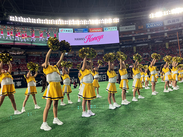 9月もみずほPayPayドームにて、ハニーズダンスアカデミーの生徒たちが元気いっぱいのパフォーマンスを披露しました。観客からは温かい声援と拍手が送られ、出演した生徒にとっても夏の思い出に残る貴重な舞台となりました。