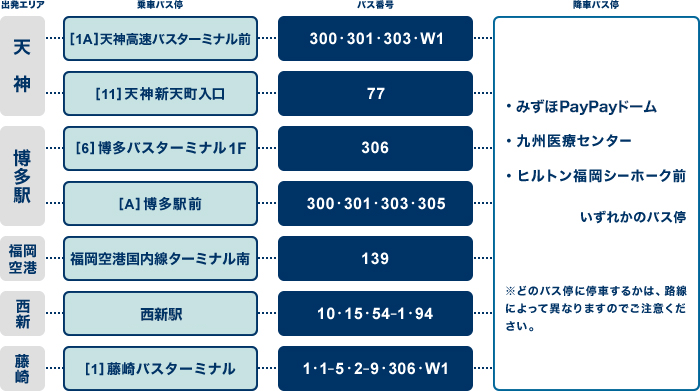 - ※公式戦やイベント開催日には直行臨時バスが運行されます。天神高速バスターミナル、博多バスターミナル6番、7番のりばよりご利用ください。また、一部の公式戦やイベント開催日には北九州・筑豊・久留米から臨時高速バスが運行されます。
