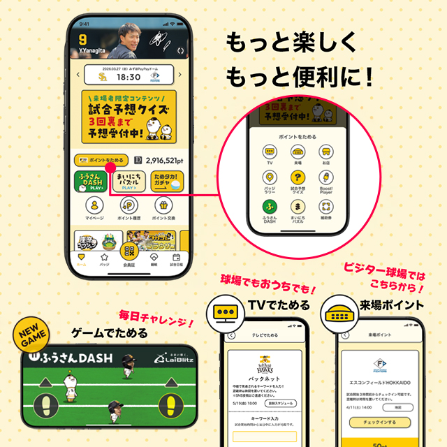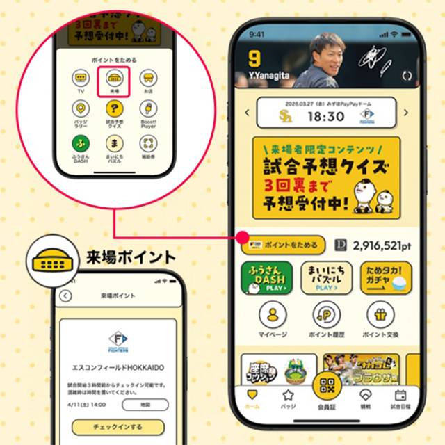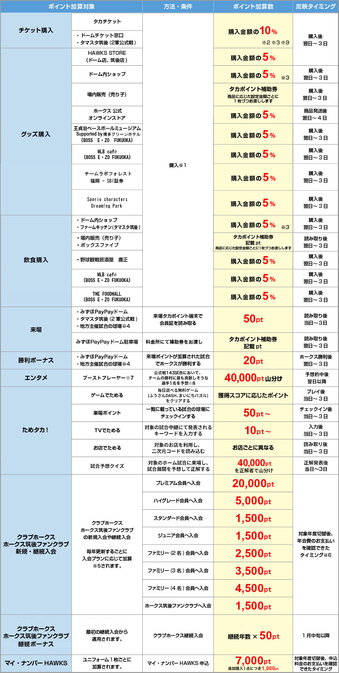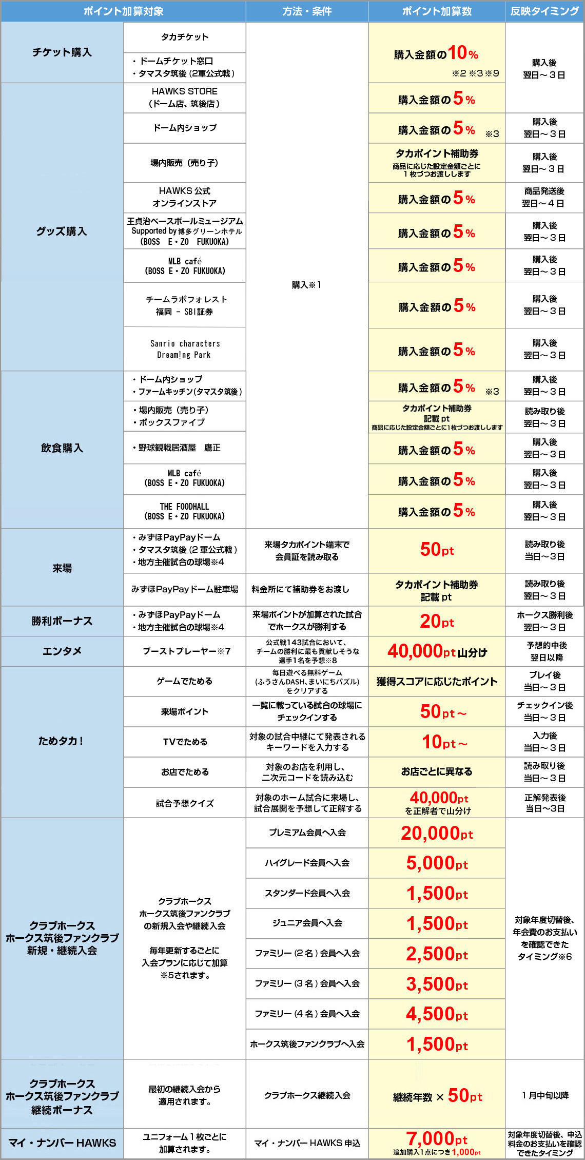 タカポイントは、チケット、グッズ、飲食の購入や、ホークス主催試合、BOSS E・ZO FUKUOKAへの来場など、さまざまな場面で貯まります。ホークスを応援して、たくさんポイントを貯めよう。