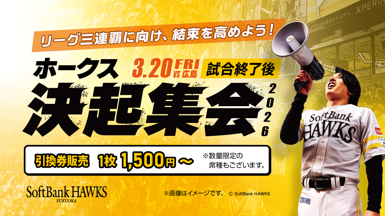 3月20日(金・祝)の試合終了後に選手がライドスタンドに登場して決起集会を開催!決起集会でホークス選手が登場する「ホークス応援指定席(1塁側外野エリア)」を販売中
